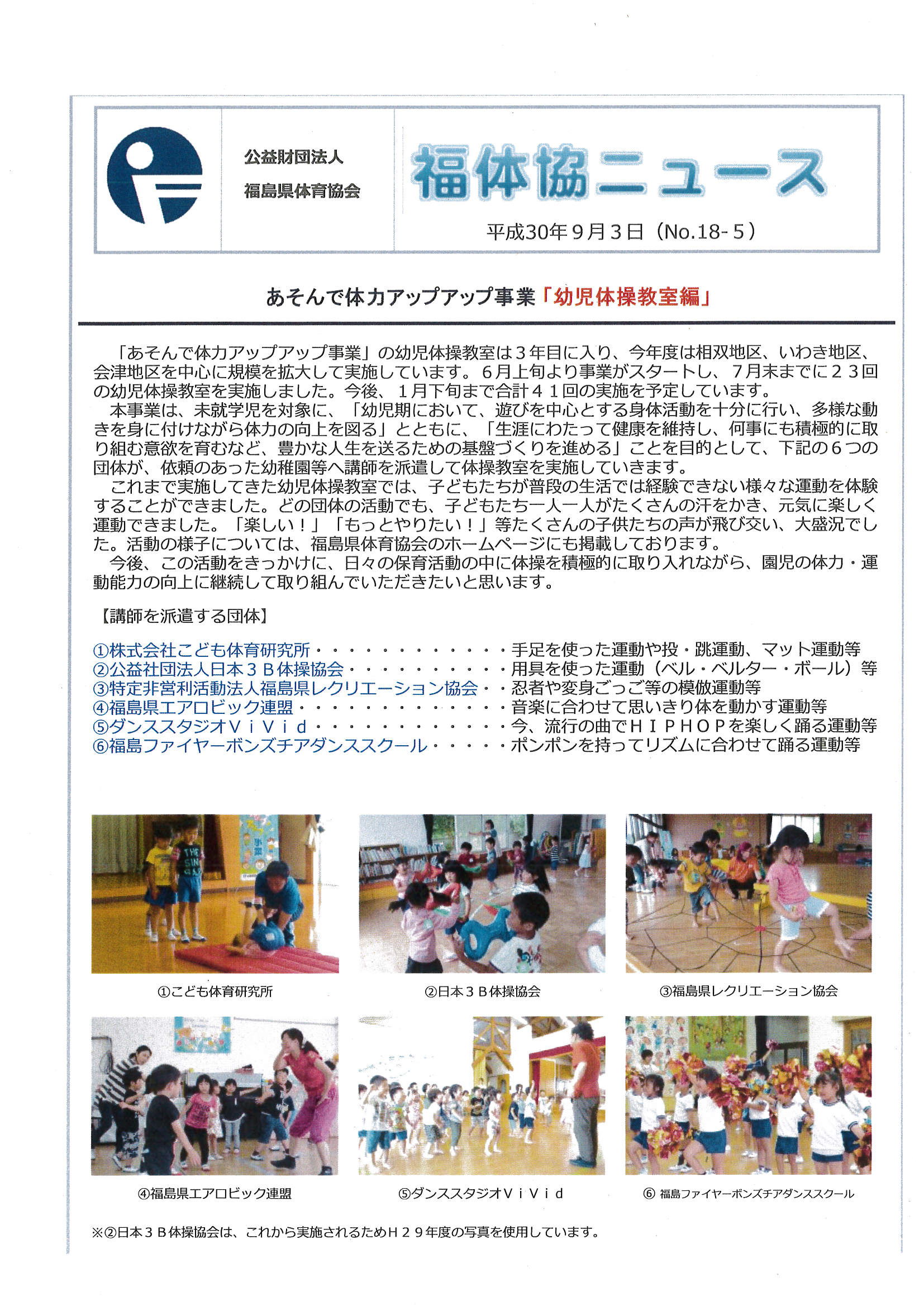 福体協ニュース(No,18-5)あそんで体力アップアップ事業「幼児体操教室編 」「指導者養成講習会編」、「ふくしまJアスリート」強化支援事業「メディカルチェック(前期)」 福体協ニュース(No,18-5) 平成30年9月3日(月)発行